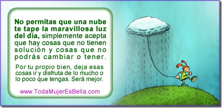 No dejes que una nube te tape la maravillosa luz del día, simplemente acepta que hay cosas que no tienen solución y cosas que no podrás cambiar o tener. Por tu propio bien, deja esas cosas de lado y disfruta de lo mucho o lo poco que tengas. Será mejor, merece la pena vivir feliz así.
