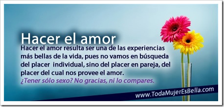Hacer el amor, por el contrario, resulta ser una de las experiencias más bellas de la vida, pues no vamos en búsqueda del placer individual, sino del placer en pareja, del placer del cual nos provee el amor; buscamos que nuestra pareja por medio de su cuerpo y de una manera “tangible” sienta lo que nuestro corazón no puede expresar con las más finas y elaboradas palabras. Cuando hacemos el amor, no sólo amamos a nuestras parejas sino también a nosotras mismas, pues no nos violentamos con efímeras banalidades que sólo distorsionan el sendero de la sensatez. Una persona que no amemos sinceramente, no es digna ni tan siquiera de que le regalemos un beso en la boca…
